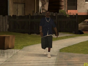 Sometimes the player can witness an NPC stealing a car. The thief can be almost any NPC surrounding the player and the area. Any car can be stolen, including Sweet's Greenwood, a BMX, any player's personal vehicle (customized or not), and even a Rhino tank. If the player enters his garage, the NPC can enter too and steal a parked car (if nitro is installed before, it will be activated when the car starts to move.) If the player begins to follow the stolen car, the NPC will drive very recklessly, smashing into other cars, pedestrians, street lights, etc. If he passes by a cop car, the cops will start to chase him. When driving, the thief is seen with a pistol in his hand. However, when he gets out of the car (or jumps out if the car is on fire,) he will pull out a knife (or sometimes a Micro Uzi) and start to attack the cops. If he survives, he will attack pedestrians around him. Soon after that the thief will steal a random car (even if it's driven by an NPC) and drive away.