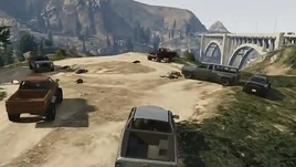 Like in the movie, the player stumbles upon a drug deal gone wrong. The player finds a group of cars, filled with bullet holes and having their horns on, parked in a clearing in the forest. Clearly, a drug deal has ended badly, and there are few survivors. Various bodies of dead drug dealers litter the area, and some are still alive but wounded on the ground, implying that one of the parties involved in the drug deal shot the other one and intended to get away with both the money and the drugs. Down a hill past the cars is one last drug dealer sitting by a silver briefcase who is also dying of his wounds. He warns the player not to take the case as they will be hunted down for it. The case contains $25,000 that Trevor, Michael, or Franklin can take from the scene. Once the case is taken away from the area, a gang of drug dealers will pursue the player and demand the case back. The player has to kill them to keep the money.