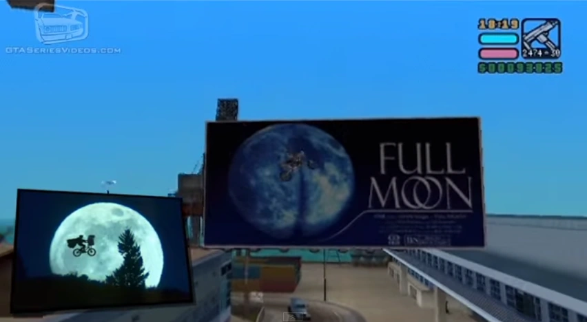 If the player climbs onto a roof to the left of the billboard via a placed ramp, the image with the moon becomes clearly visible and shows the famous image of the moon scene taken from Steven Spielberg's film E.T. the Extra Terrestrial.