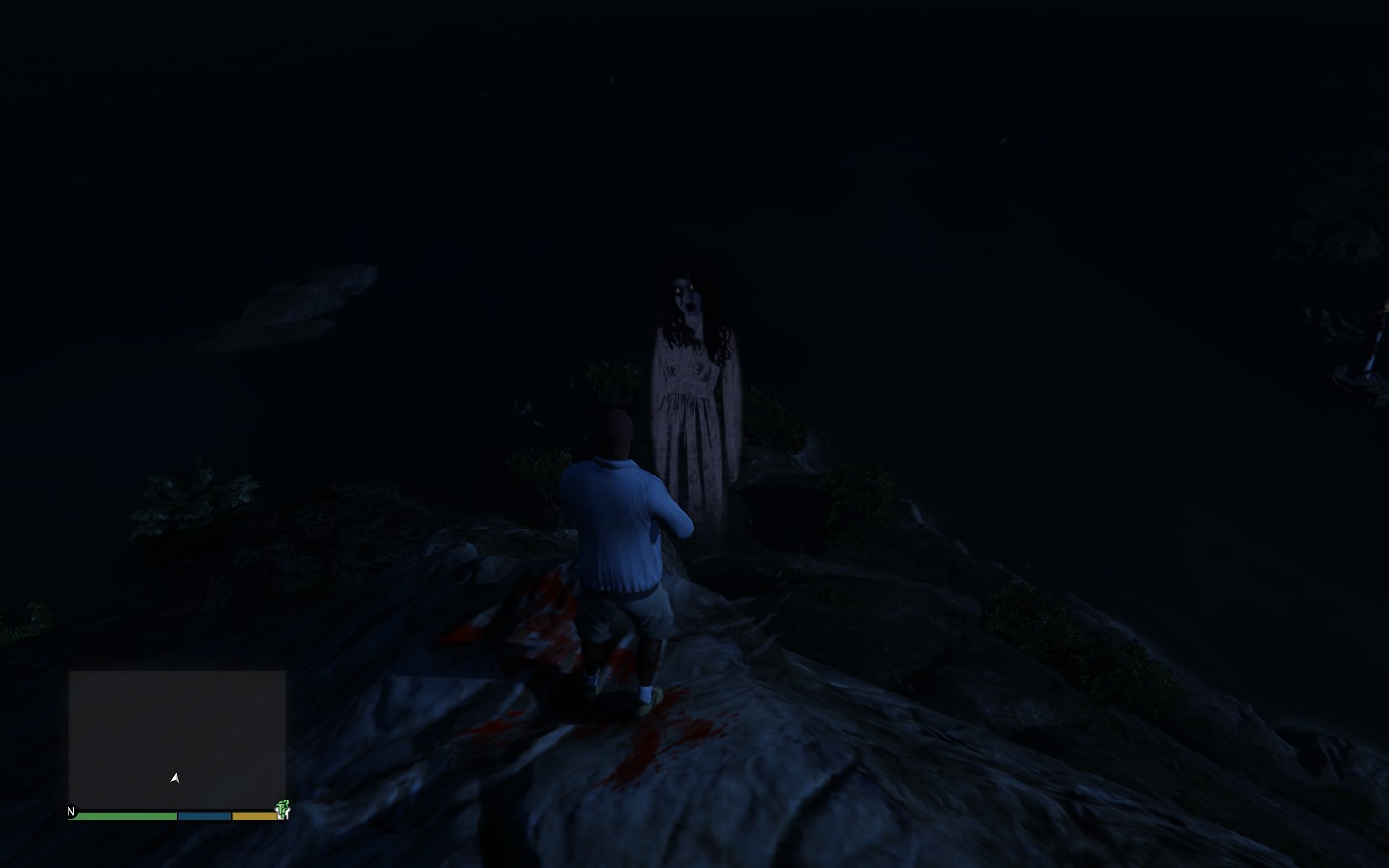 Between 23:00 and 0:00, the player will be able to witness a ghost manifest itself near the rock. The ghost appears to be a female, with long black hair and a white dress or robe. The ghost itself appears to be slightly translucent. It appears to fade away from view if the player tries to get close to it, but it can still be seen through a sniper sight or the Phone's camera.
