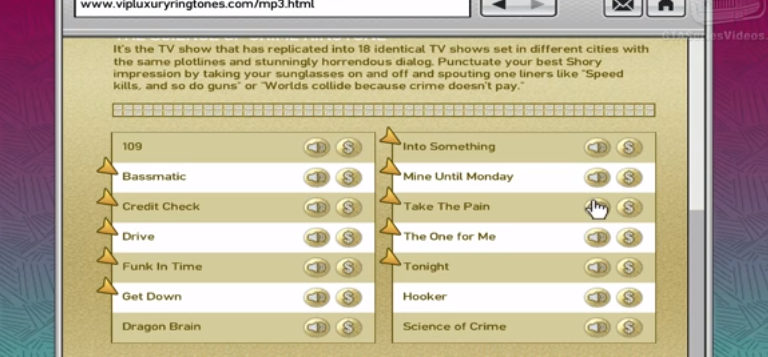 On the in-game website, www.vipluxuryringtones.com, various parodies of real life songs can be set as ringtones. Among real-life songs, there are GTA Melodies. There are songs from Head Radio and Lips 106 radio stations from GTA Liberty City Stories. The ringtone called Pager is a reference to the pager melody from GTA III and the opening sequence from GTA Vice City. This is also an 8-bit version of the Joyride theme for GTA 1.