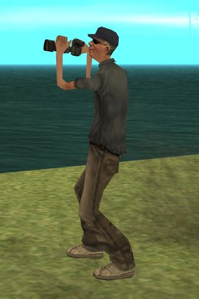 If the player aims a weapon at the photographer, he will stop taking pictures and begin the surrender animation. However, instead of running away when they put their arms down, the photographer will instead walk into the ocean like normal. The player can also force the pedestrian to walk into the water by jacking cars or starting fights near its position. If the player attacks the photographer, they will repeatedly snap photos of CJ, as the game still considers the camera a weapon, and will pursue him until the player kills the photographer.