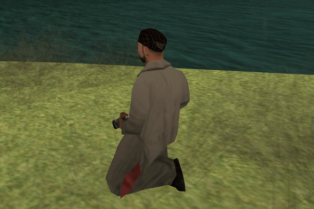 The pedestrian is unique in that a range of pedestrian models from across San Andreas has a small chance of spawning. Pedestrians from Los Santos and the San Fierro countryside can be found as the photographer, but mostly they will spawn as one of the desert pedestrians, such as Mr. Trenchcoat. This is because to spawn the photographer, the player must approach the Los Santos Inlet from the Flint Intersection. In the game's files, the Flint Intersection's ped group is actually POPCYCLE_GROUP_DESERT_FOLK instead of POPCYCLE_GROUP_FARMERS, causing the photographer to appear as desert pedestrian thanks to the spillover from approaching the inlet.