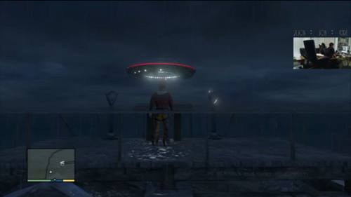 A flying saucer appears at the top of Mount Chiliad at 3:00 AM on a stormy night, when the player has attained 100% completion. It is believed to be a hologram, as it does not react to bullets or explosions, and disappears if the player gets too close or too far. There is also a distortion effect around the UFO, and raindrops around it will turn pixelated, and will switch colors. However, it is unknown where the hologram is projected from. The glyphs on the western side of Mount Chiliad state the conditions for this to appear and further clues including a UFO shaped glyph under the viewing platform at the top, and a sign on the far side of the platform stating Return when your story is complete in red spray paint. It is most likely that this is a government made stealth aircraft for testing or MIB style UFO, as it has FIB written on it.