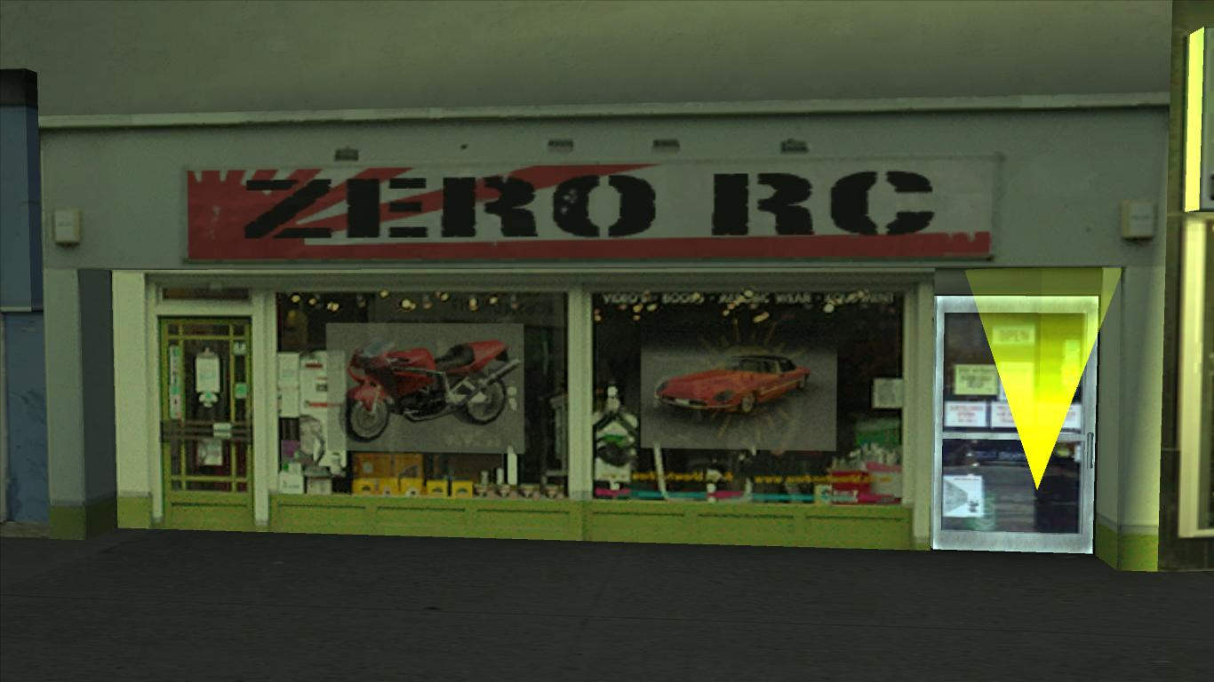 Zero RC is a small hobby shop located in Garcia, San Fierro, which specializes in remote control toys, scale models, and action figures. It is owned and named after Zero, a timid computer hacker who works for Carl Johnson. CJ eventually buys the shop from Zero, seeing a property development opportunity. Because of its appearance in cutscenes and missions, the RC shop has many Easter eggs hidden inside.